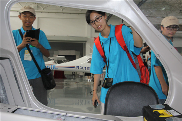 营员在飞机模型前合影留念